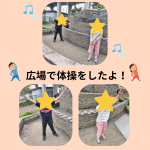 2025年10月14日 / 最終更新日時 : 2025年10月14日 yeep 活動記録 【広場でのびのび体操🌤】 こんにちは! イープ放課後デイです♪ 広場で元気いっぱいに体操をしました! 青空の下で体を動かしてリフレッシュ✨ 音楽に合わせてジャンプやストレッチをしたり♪ 笑顔いっぱいの気持ちのいい時間になりました💓